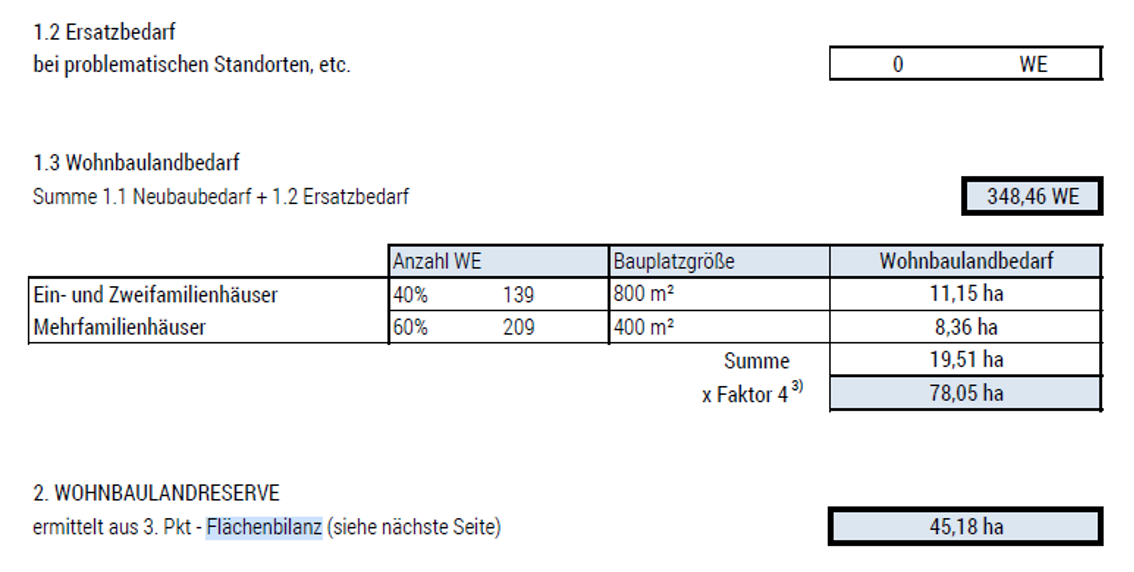 Die unsererseits dargestellten Zahlenwerte sind korrekt. Sie stammen aus den Bearbeitungen zur Ermittlung der Baulandflächenbilanz des FLWP 1.0 (siehe Abbildung) durch den Raumplaner. Es handelt sich um einen im Zuge der Auflage zum FLWP integrierten Bestandteil der Verordnung.
